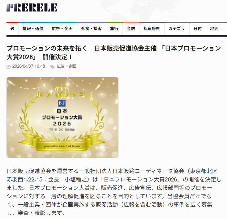 ぷれりりに「プロモーションの未来を拓く 日本販売促進協会主催 「日本プロモーション大賞2026」 開催決定!」が掲載されました。